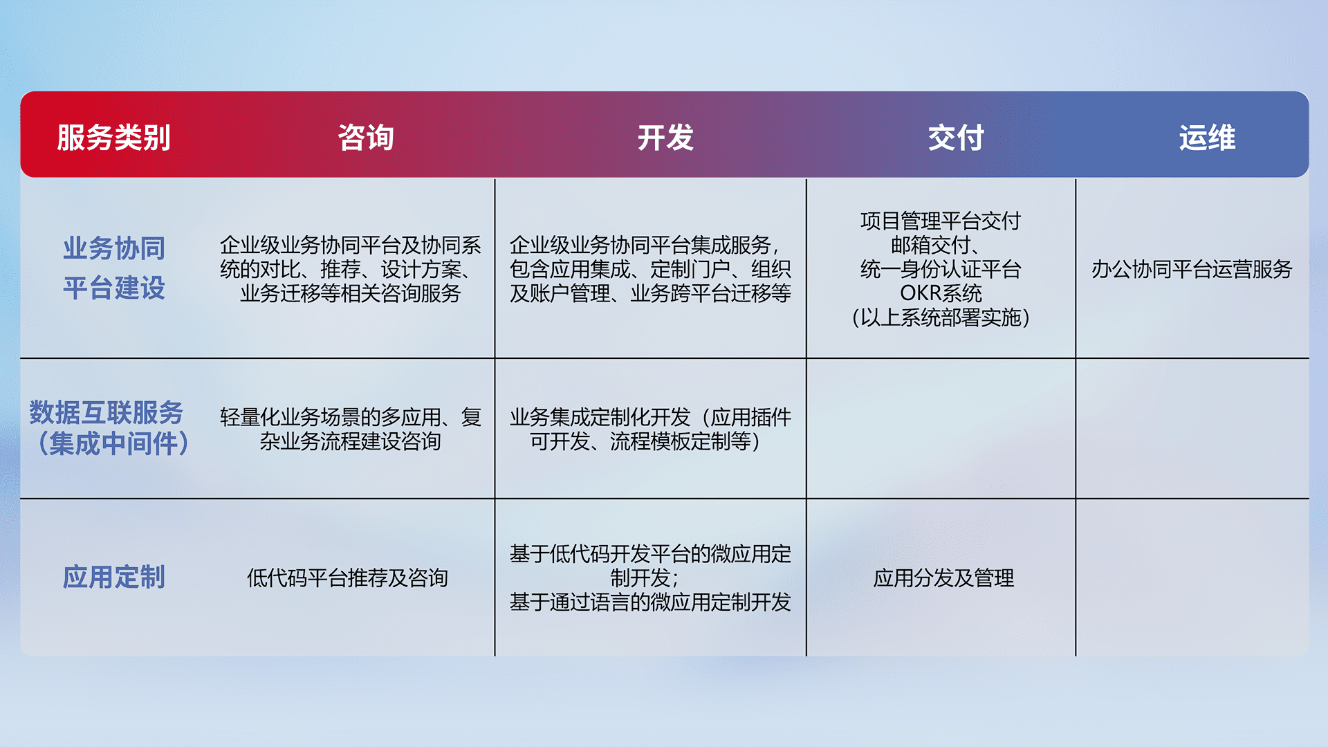 针对钉钉、、、、企微、、、IDaas等平台级产品提供产品的规划、、方案、、交付、、、、定制化开发等服务,,,实现如统一协同办公、、、智能客户服务、、、混合会议管理、、、、智能数据查询、、、等业务场景,,,实现数字化转型。。。。