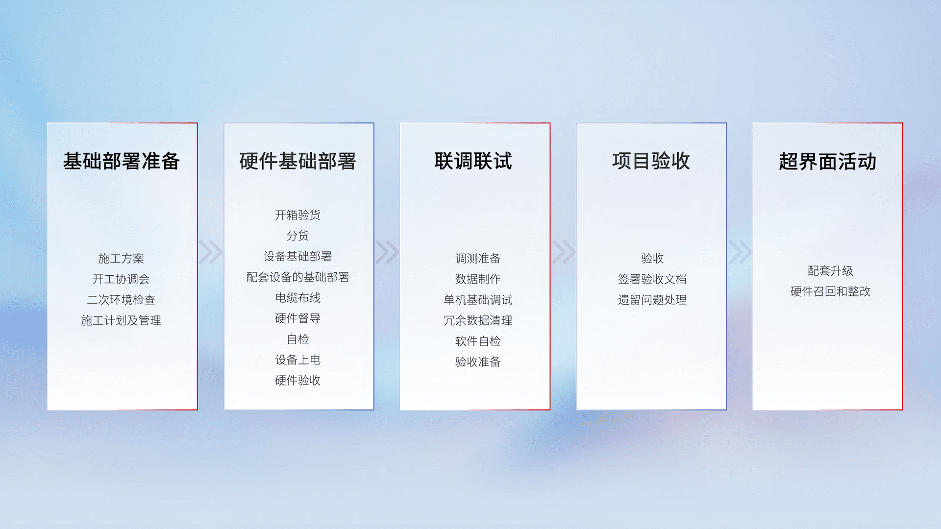 从基础部署准备、、硬件基础部署、、联调联试、、、、项目验收、、、、越界面活动的全过程可追溯,,,保证施工质量和进度。。。